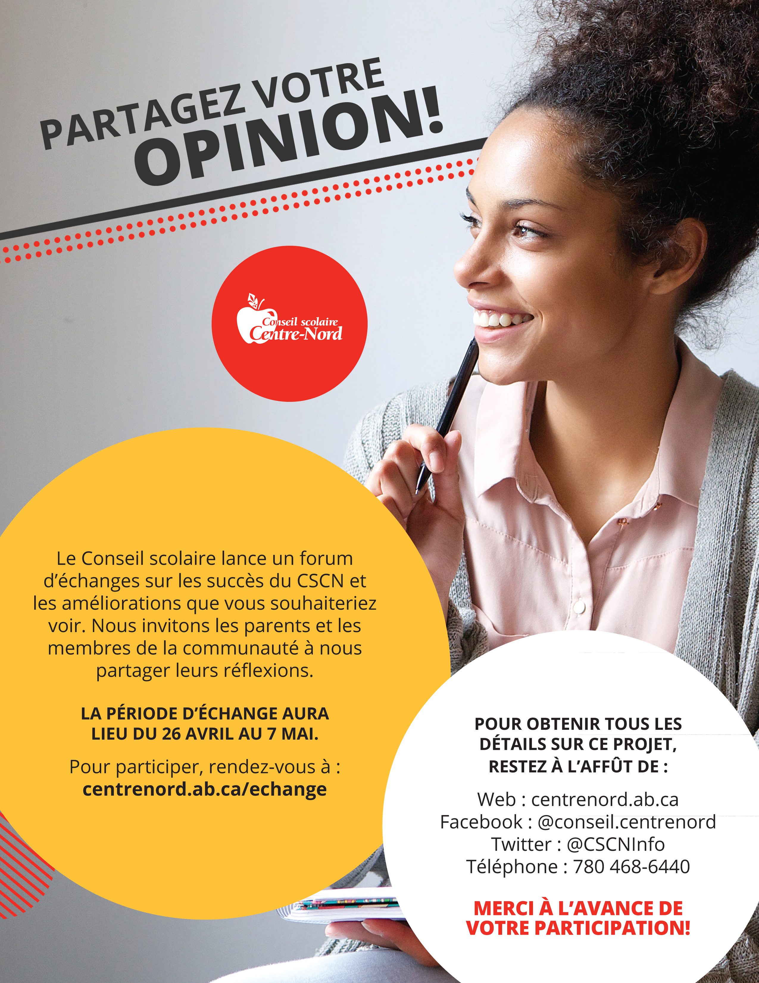 Le Conseil scolaire lance un forum d’échanges sur les succès du CSCN et les améliorations que vous souhaiteriez voir. Nous invitons les parents et les membres de la communauté à nous partager leurs réflexions.