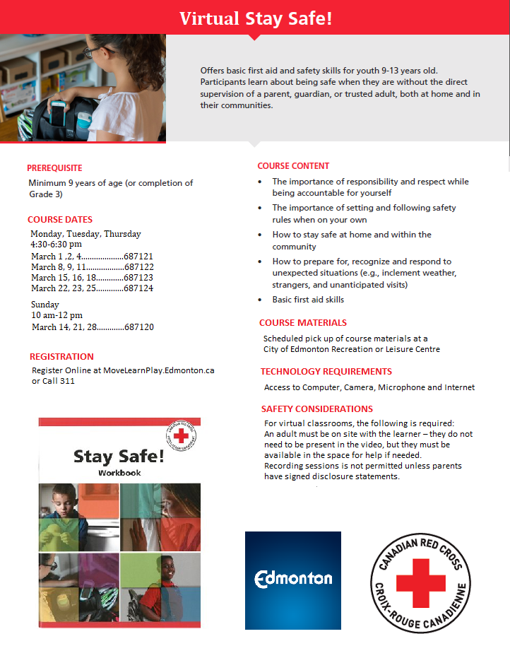 La Croix-Rouge Canadienne offre un cour virtuel de Prêts à rester seul à la maison pour les jeunes de 9 ans et plus. Veuillez noter que la formation est en anglais.