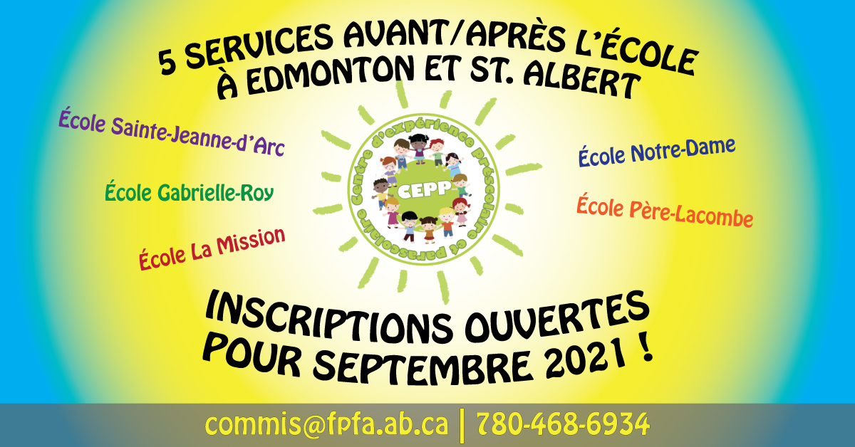 Les inscriptions sont lancées pour le CEPP pour septembre 2021! Nous offrons un service de garde Avant/Après l'école à Edmonton et St-Albert. Veuillez communiquer avec nous au 780 468-6934 ou Cette adresse e-mail est protégée contre les robots spammeurs. Vous devez activer le JavaScript pour la visualiser.