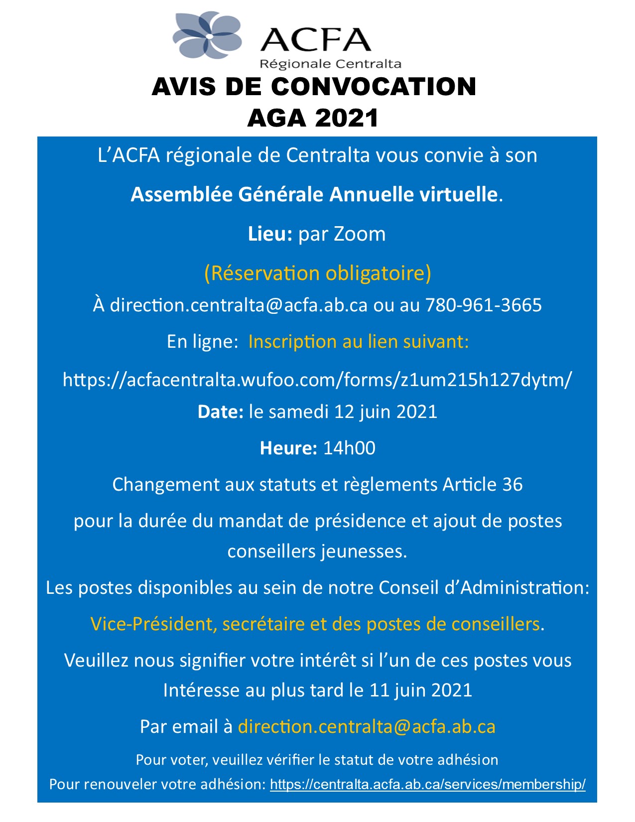 ACFA Régionale Centralta - Avis de convocation AGA 2021